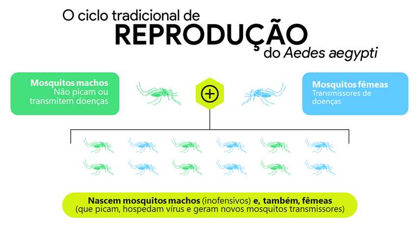 Veja como funciona a diferença do ciclo de reprodução tradicional do mosquito Aedes aegypti e do Aedes do Bem™